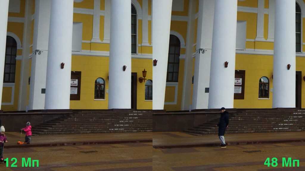 В приложении камеры предлагается использовать как двукратный «гибридный» зум, так и расширенный угол обзора (0.6x). Во втором случае задействуется широкоугольная камера с 8-мегапиксельным сенсором и объективом светосилой f/2,2, лишённым автофокуса. Снимать на широком угле есть смысл только при хорошем освещении — в сумерках и ночью снимки выглядят не очень чёткими. Зум же, несмотря на свой программный статус, отрабатывает вполне уверенно, в том числе при недостаточном освещении.