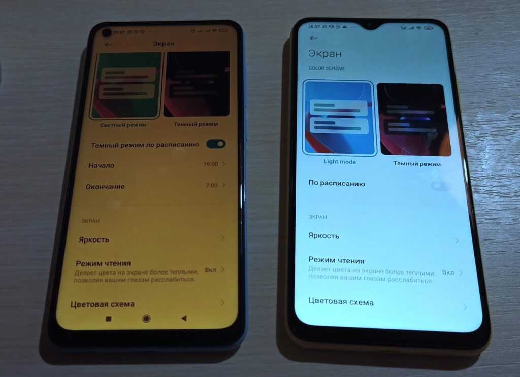 Ну, а если сравнить эти два дисплея визуально, то можно увидеть, что Poco M3 выдает более естественный белый цвет, тогда как у Redmi Note 9 дисплей уходит в тёплые тона. При этом, если включить ещё и режим защиты глаз, то увидим просто оранжевый экран. Хотя я не исключаю, что это проблема именно моего образца, потому что у владелицы смартфона изначально были проблемы.