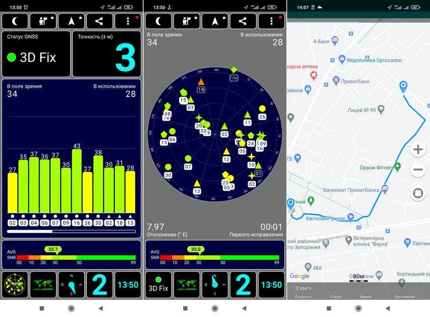 С навигацией все тоже хорошо: с включенным интернетом, время первой фиксации составило 1 секунду. Менее, чем за 15 секунд было найдено 34 спутника, 28 из которых имели активное соединение. Точность позиционирования 3 метра. Магнитный компас присутствует.