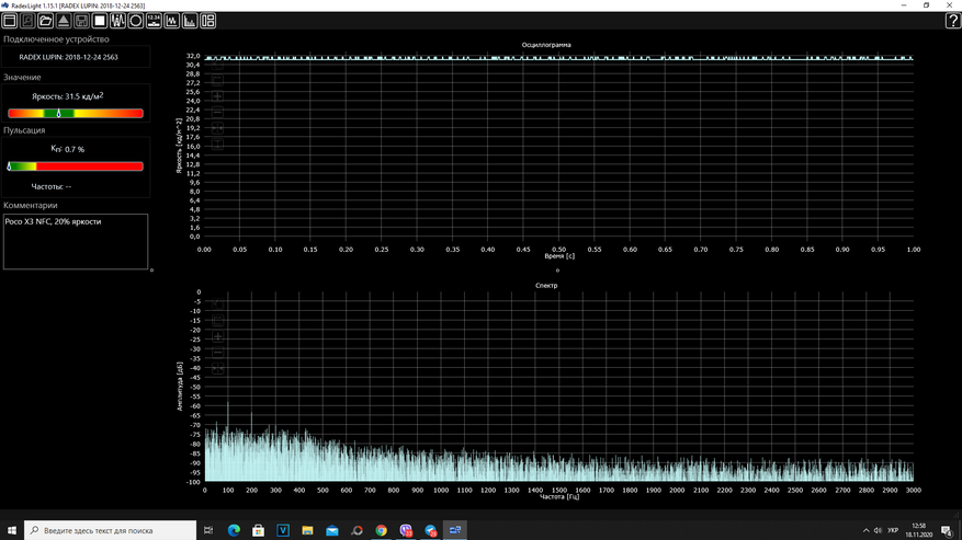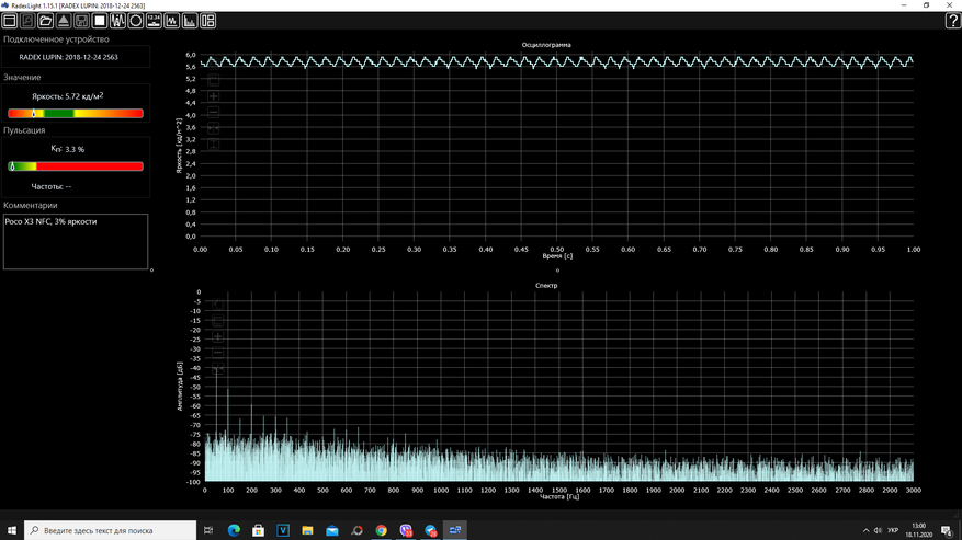 Пульсометр показал отсутствие мерцания подсветки на всем диапазоне яркости от 100% до 3%, где коэффициент пульсаций не превышает всего 1% при норме около 15%.
